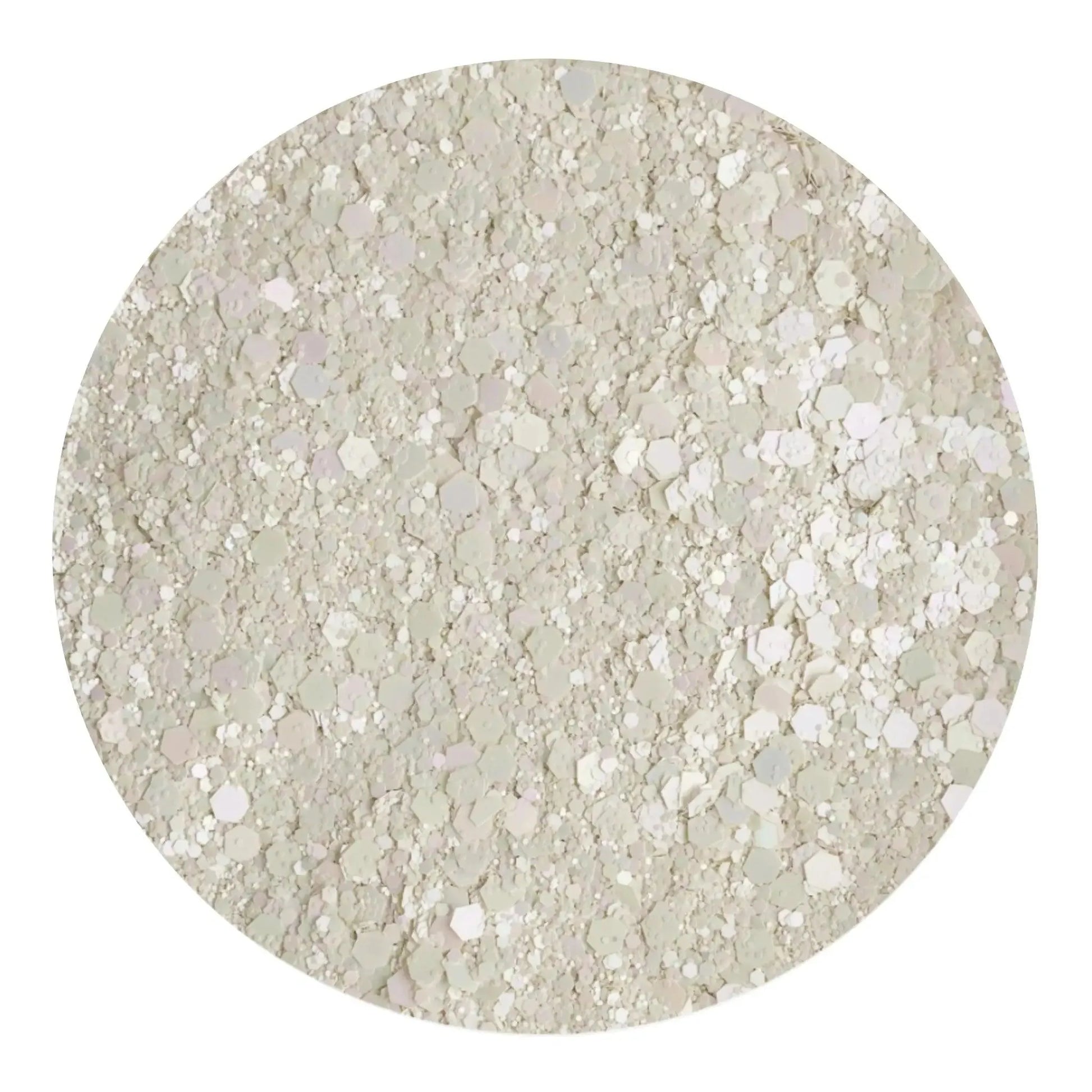 - Features shimmering chunky flakes in soft, snowy white tones for a charming pastel effect
